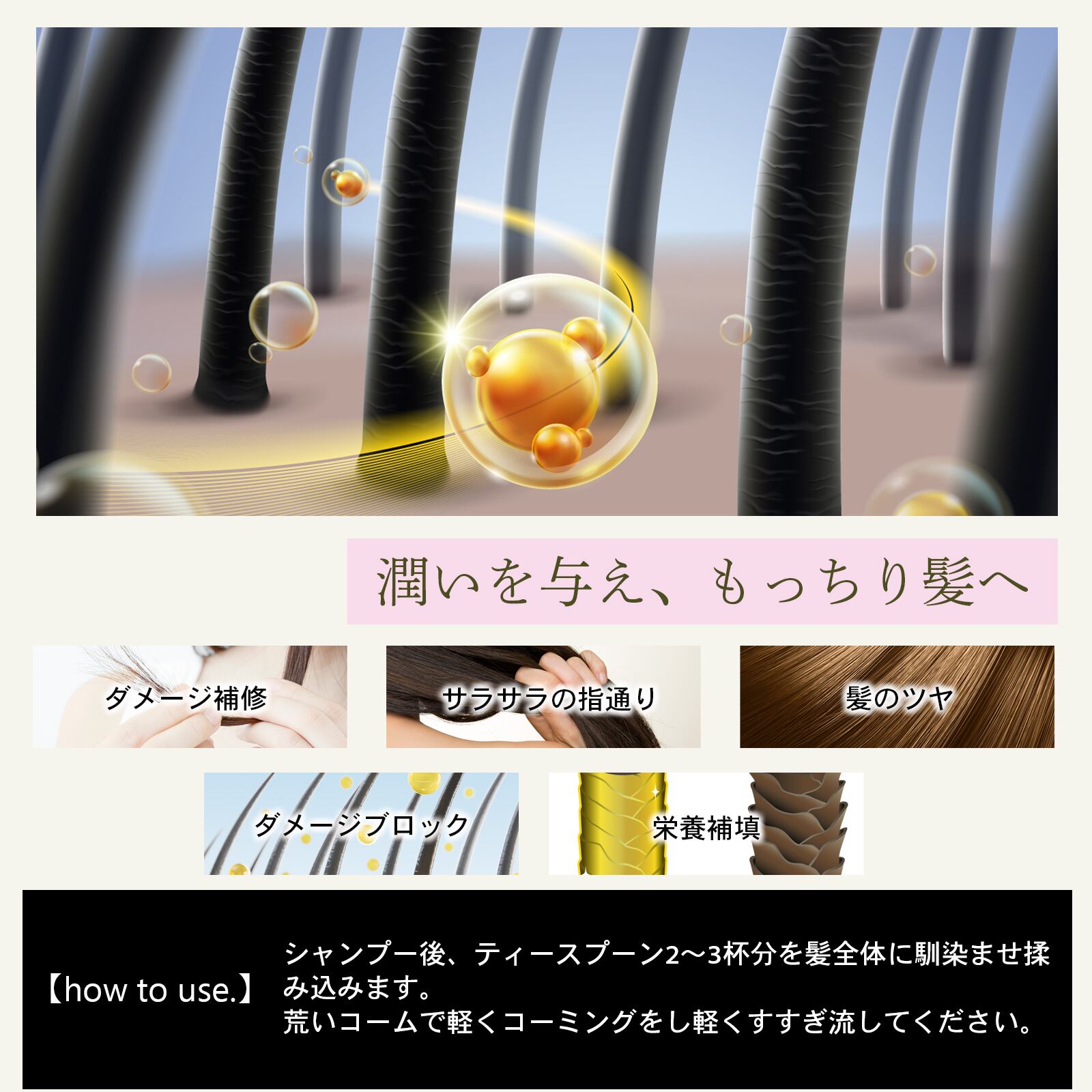 シャンプー後、ティースプーン2〜3杯分を髪全体に馴染ませ揉み込みます。