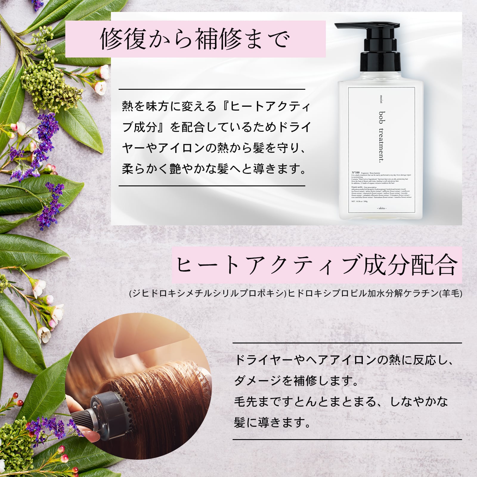 熱を味方に変える『ヒートアクティブ成分※ 』を配合しているためドライヤーやアイロンの熱から髪を守り、柔らかく艶やかな髪へと導きます。