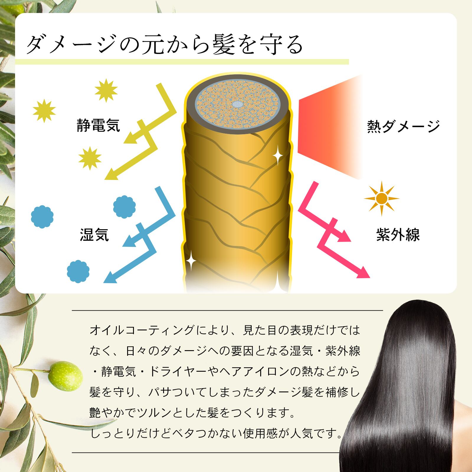 オレイン酸を多く含んだ良質なオーガニックオイルを配合しており、スタイリングすることで濡れ髪/束感/毛先の動き/ツヤを出し、クセ/湿度による広がりを抑えます。
