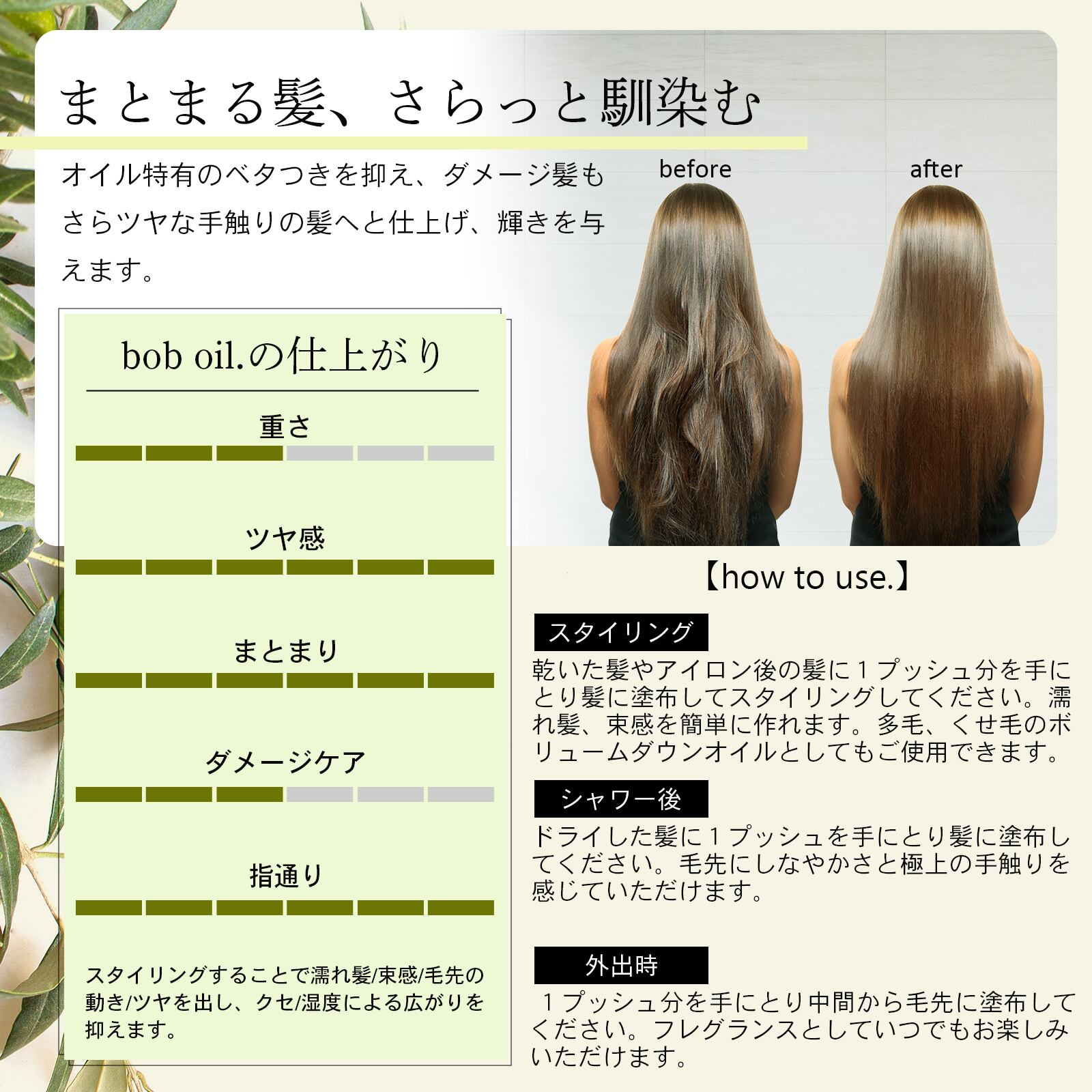スタイリング : 乾いた髪やアイロン後の髪に1プッシュ分を手にとり髪に塗布してスタイリングしてください。濡れ髪、束感を簡単に作れます。多毛、くせ毛のボリュームダウンオイルとしてもご使用できます。